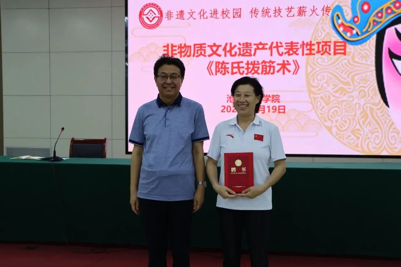 9月19日,作为掌门人的陈秀云女士及其嫡传弟子们来到伟德,向伟德师生展示非遗文化——陈氏拨筋术。党委书记云电军向陈秀云颁发客座教授证书。党委常委、副校长高颖出席仪式。