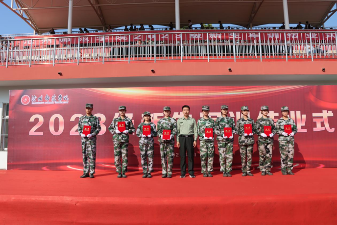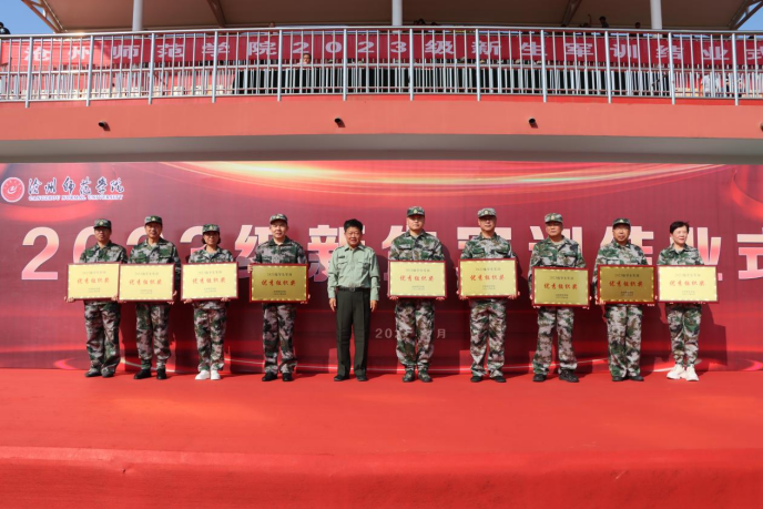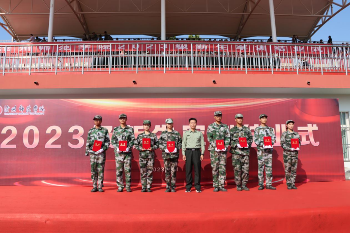 谢云岭为学生军训“优秀军训标兵”获奖者颁奖