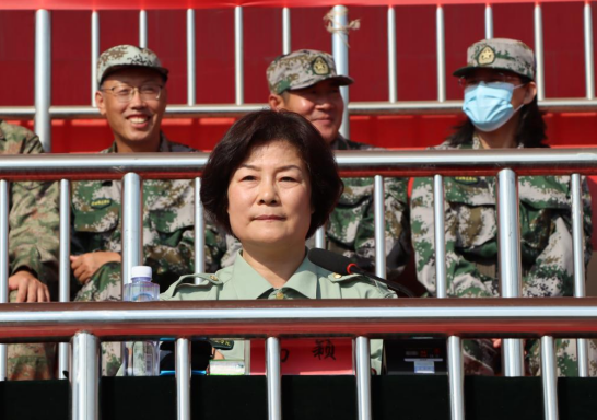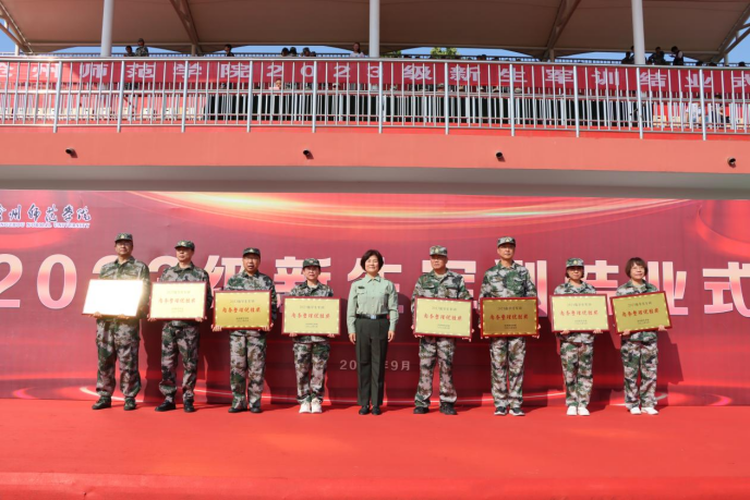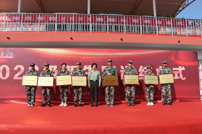 高颖为学生军训“军歌比赛优胜奖”获奖集体颁奖