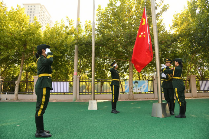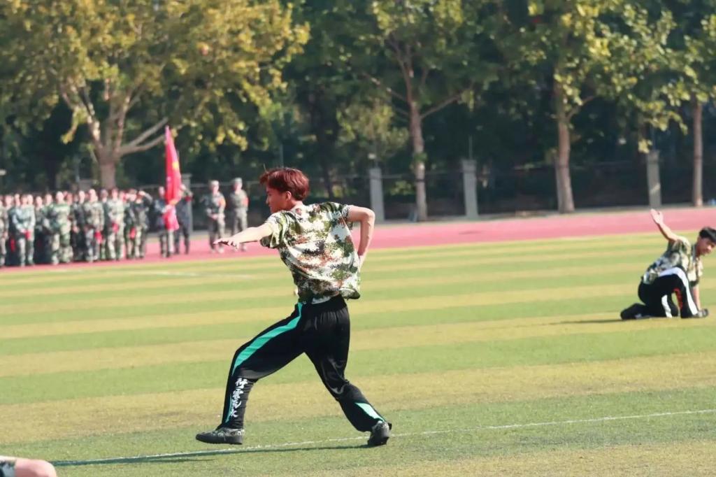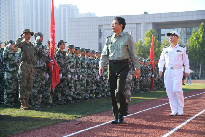 党委书记云电军在相关人员陪同下,检阅了各方阵队列。同学们军容整肃、纪律严明,以整齐划一的嘹亮口号向校领导致意。“同学们好!”“书记好!”“同学们辛苦了!”“强国有我,为校争光!”的口号声响彻操场。