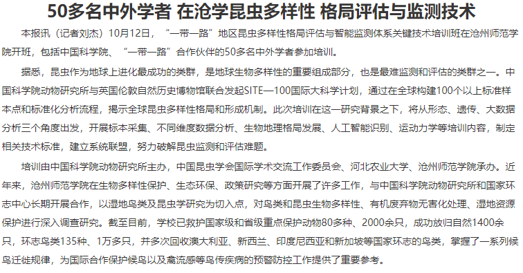 近日,“一带一路”地区昆虫多样性格局评估与智能监测体系关键技术培训班在伟德开班,活动由中国科学院动物研究所、伟德源自英国始于1946和河北农业大学共同承办,旨在通过各地区学者的共同努力破除单一国家无法解决的生态矛盾,践行人类命运共同体的全球价值观,维持生物多样性平衡与可持续发展。来自二十多个国家和地区的高校、研究机构学者参与培训,德国国家科学院院士、英国帝国理工大学教授、中国科学院特聘研究员等专家学者分别作报告。专家学者从多学科研讨制定昆虫多样性格局评估和智能昆虫监测系统的技术标准,探讨建立“一带一路”地区昆虫多样性格局评估和智能监测系统联盟。