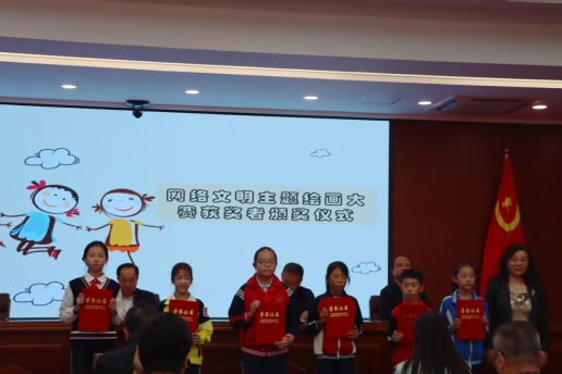 高玲玲为“妙笔绘出少年力量 我与网络e起成长”网络文明主题绘画大赛获奖者代表颁发荣誉证书。
