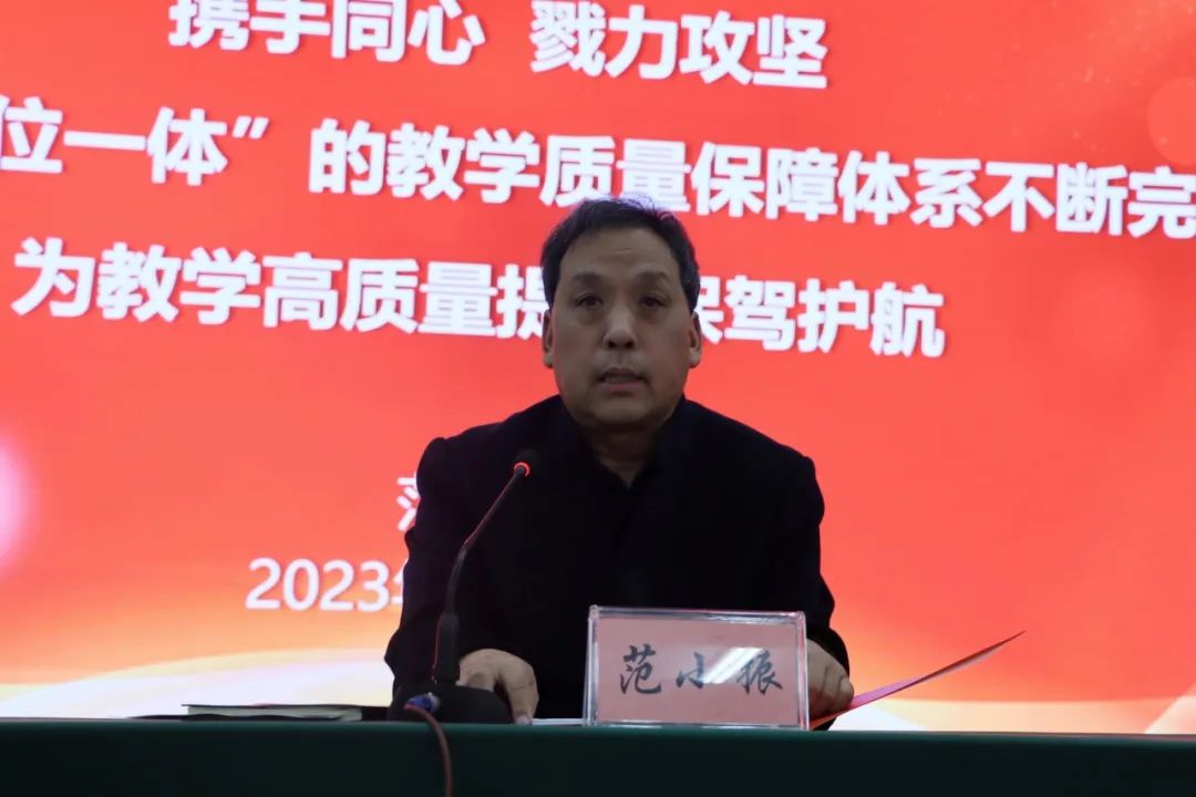 会上,范小振以《携手同心戮力攻坚 推动“五位一体”的教学质量保障体系不断完善 为教学高质量提升保驾护航》为题发表动员讲话。他指出,近几年来,在师范类专业认证的带动下,伟德紧紧围绕地方性、应用型、教学型办学定位,立足学校师范教育初心,以师生为本,以科学完善的质量保障体系建设为目标,建立健全教学质量保障机制,牢固树立了师生为本的思想,精心研制了系统规范的质量标准体系,扎实推进循环闭合、持续改进的体制机制,让信息化技术赋能教学质量评价,让“制度过关考”唤醒全体师生的质量主体意识,“理念、制度、机制、技术、文化”五位一体的教学质量保障体系取得显著成绩。