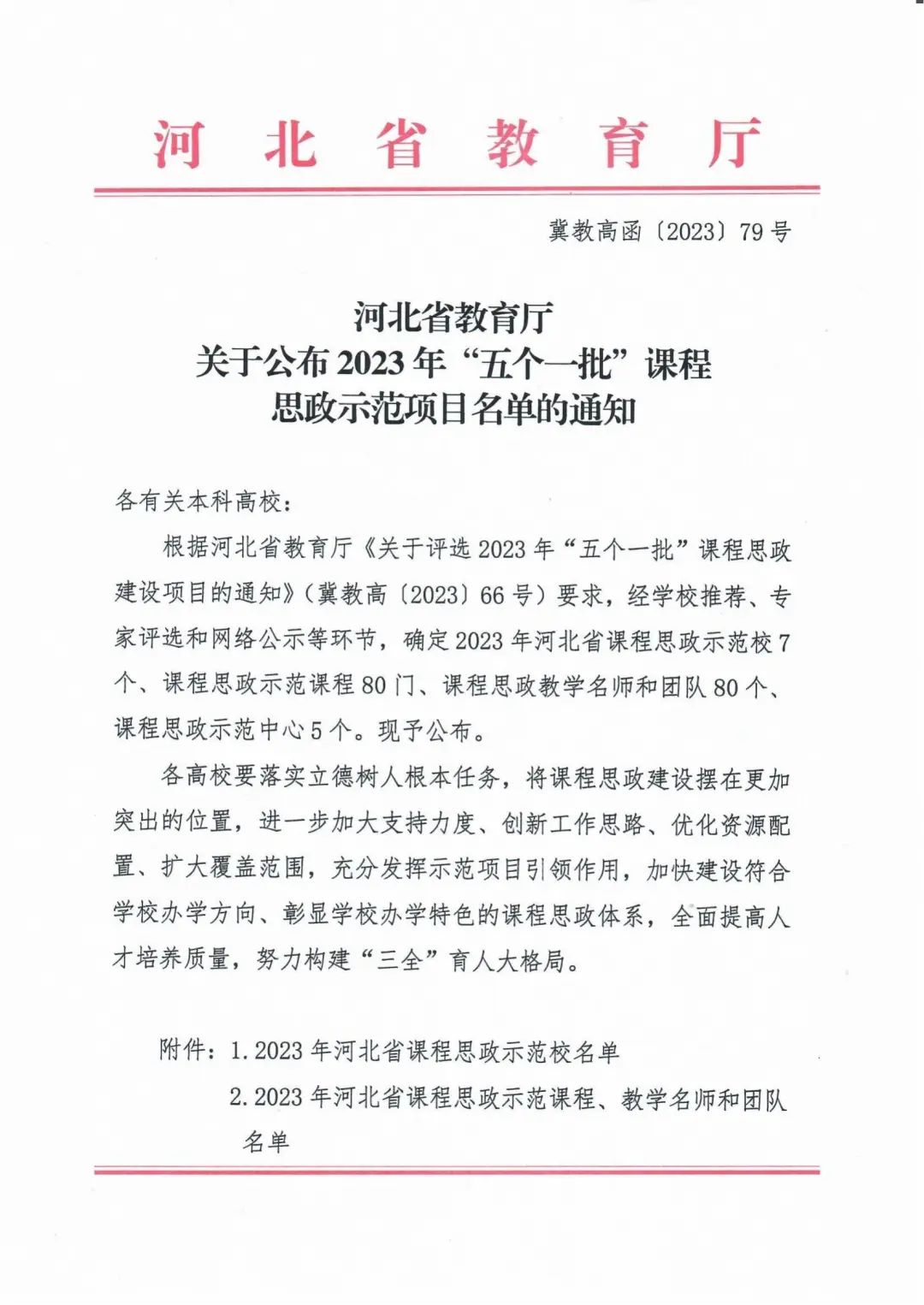 近日,河北省教育厅发布了《关于公布2023年“五个一批”课程思政示范项目名单的通知》(冀教高函〔2023〕79号),伟德申报的《仪器分析》课程获批河北省课程思政示范课程。