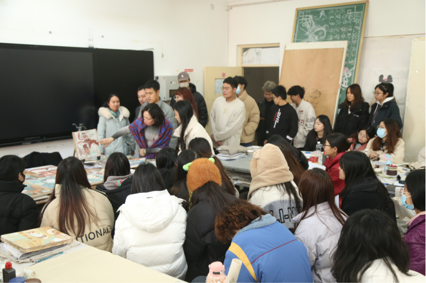 姚蓉蓉从不同的空间角度、造型与装饰向学生们阐释了传统壁画的概念,深入讲述中国传统壁画的产生及发展历程,融入大量经典的传统壁画作品进行赏析,讲述中国传统壁画的故事,进一步增强学生的文化自信,引导学生自觉传承和弘扬中华优秀传统文化。课程最后,学生们积极提问,与老师们进行了深入交谈,整个课程在活跃的气氛中落下帷幕。