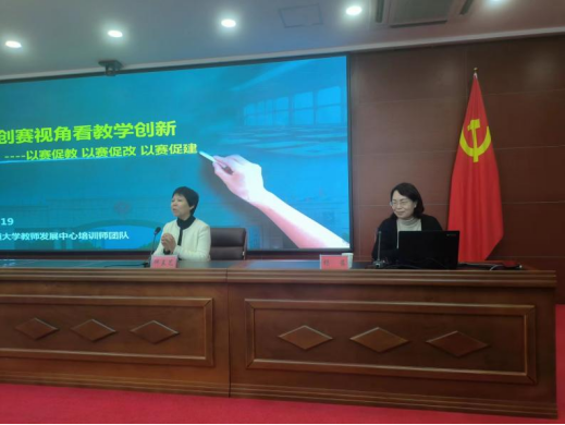 第四届河北省高校教师教学创新大赛将于2024年3月举办,目前伟德已完成院系初赛,共有35位教师(团队)进入校赛,为了帮助老师们更好地理解大赛评审标准和要求,进一步提高申报材料质量,深入推进课程教学改革,12月19日,教师培训中心特邀石家庄铁道大学教师发展中心主任、大赛评委杨茜教授及四位全国高校教师教学创新大赛获奖教师李皓玉、张增强、唐翰昭、李海艳作题为“从教创赛视角看教学创新——以赛促教、以赛促改、以赛促建”的专题培训。教师培训中心主任何兰芝主持。