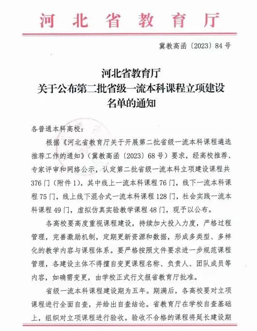 近日,《河北省教育厅关于公布第二批省级一流本科立项建设课程名单的通知》(冀教高函〔2023〕84号)发布,伟德推荐申报的大学英语、基础心理学、艺术考察、会计学、计算机网络、跨境电子商务6门课程全部获批省级一流本科立项建设课程。