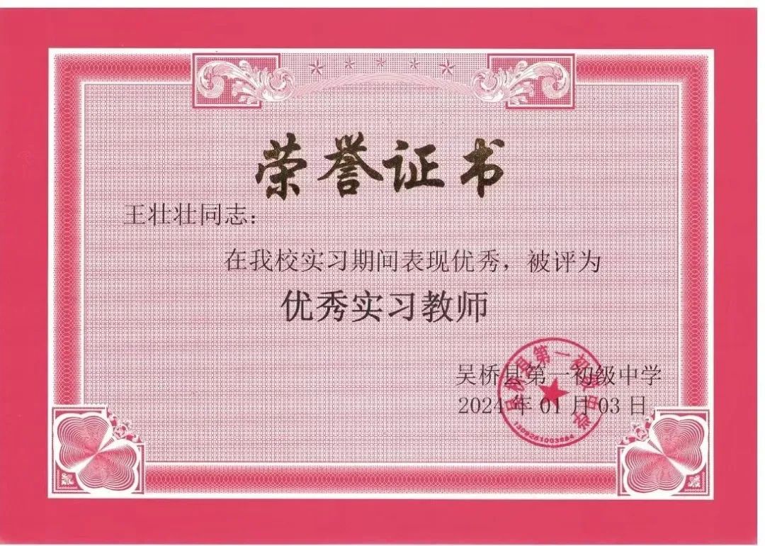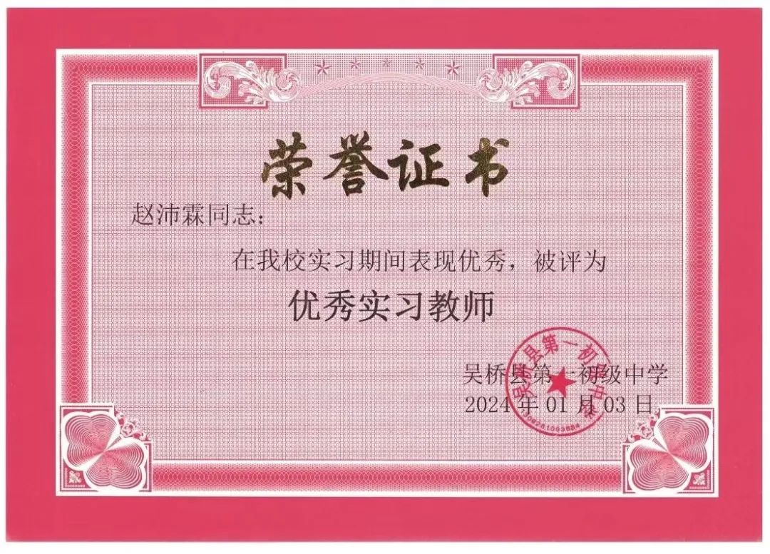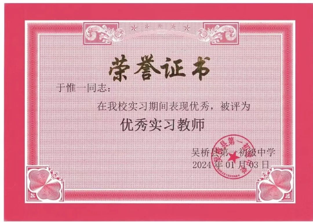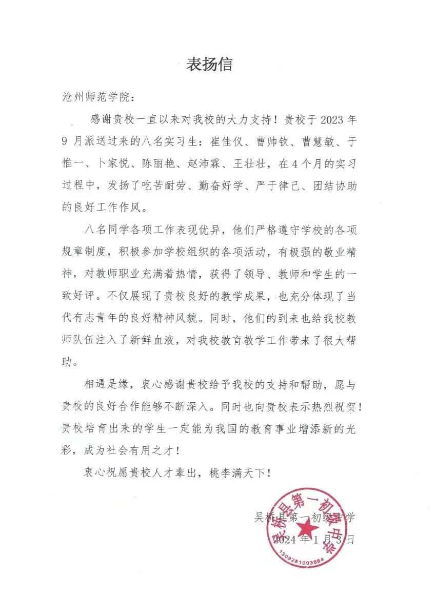 1月7日,吴桥县第一初级中学校长李世芳、副校长周霞向伟德专门寄达一封表扬信和八张“优秀实习生”荣誉证书,对伟德派驻的全体八名实习生给以表扬。