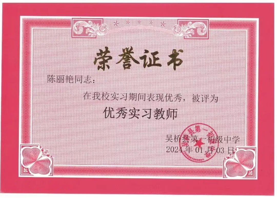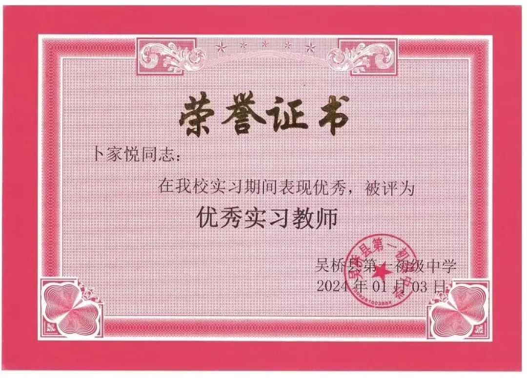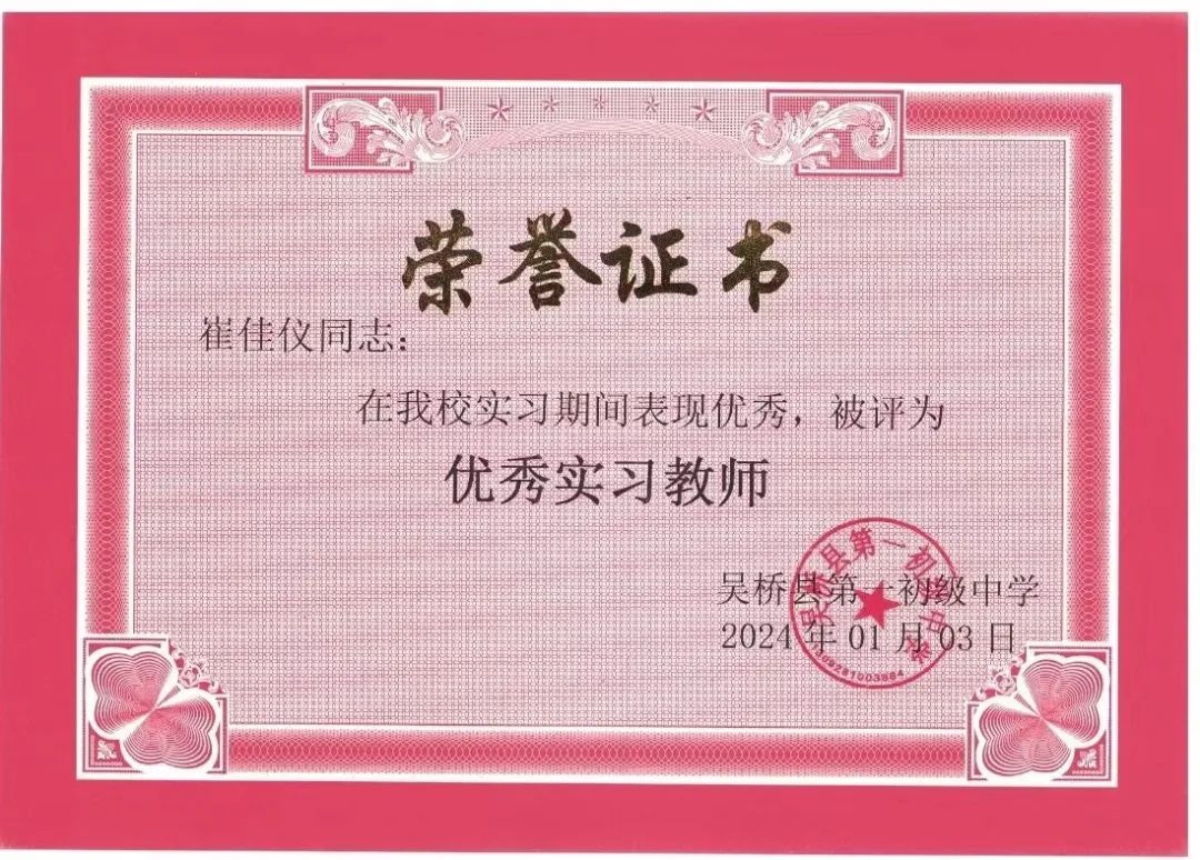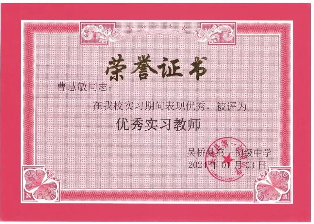 1月7日,吴桥县第一初级中学校长李世芳、副校长周霞向伟德专门寄达一封表扬信和八张“优秀实习生”荣誉证书,对伟德派驻的全体八名实习生给以表扬。