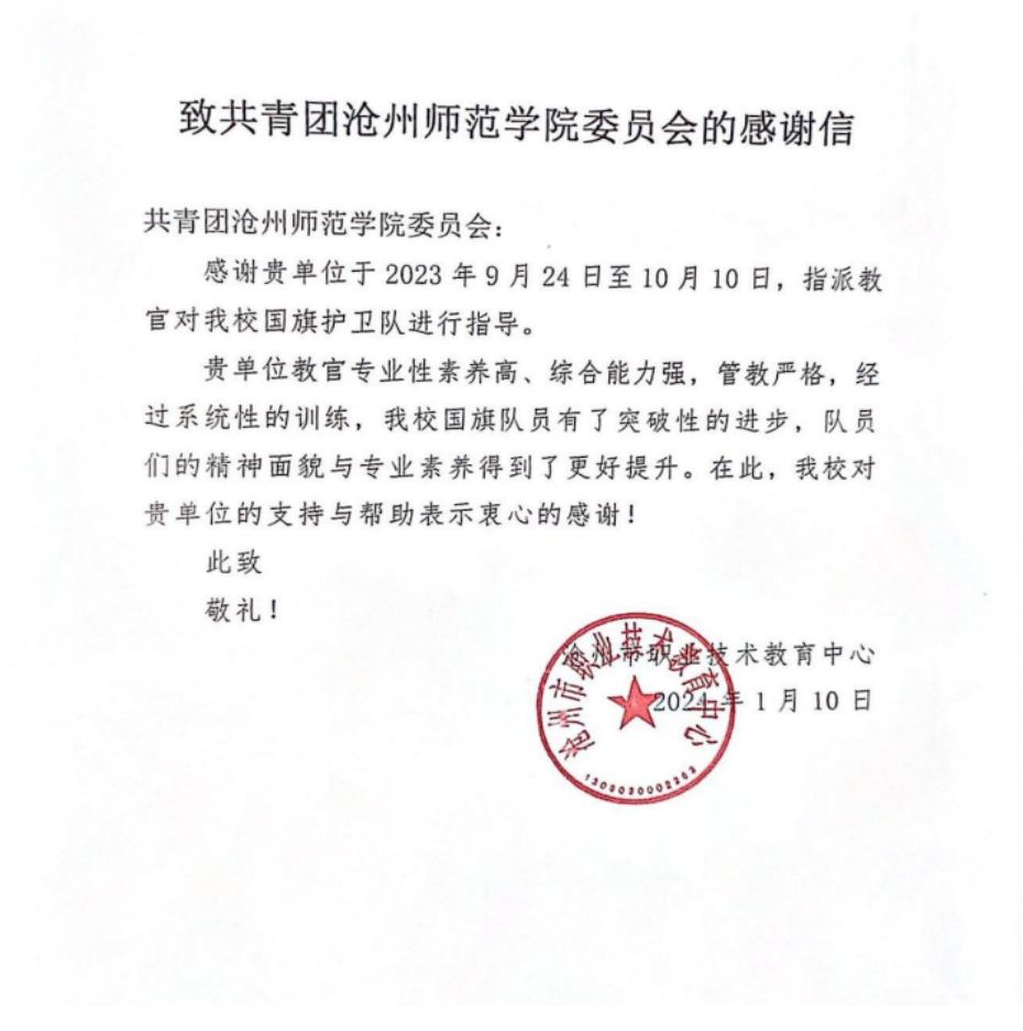 2023年9月,受沧州市职业技术教育中心的邀请,校团委派出了国旗护卫队4名优秀队员对该中心国旗班进行了业务培训。培训期间,两校学生在国旗护卫队的建设、日常训练、升旗仪式要点技巧等方面进行了深入的交流,在伟德队员的指导与培训下,该校国旗班实现了从无到有的转变,专业素质得到显著提升。未来两校将继续深化合作,为学生社团之间的交流搭建桥梁。