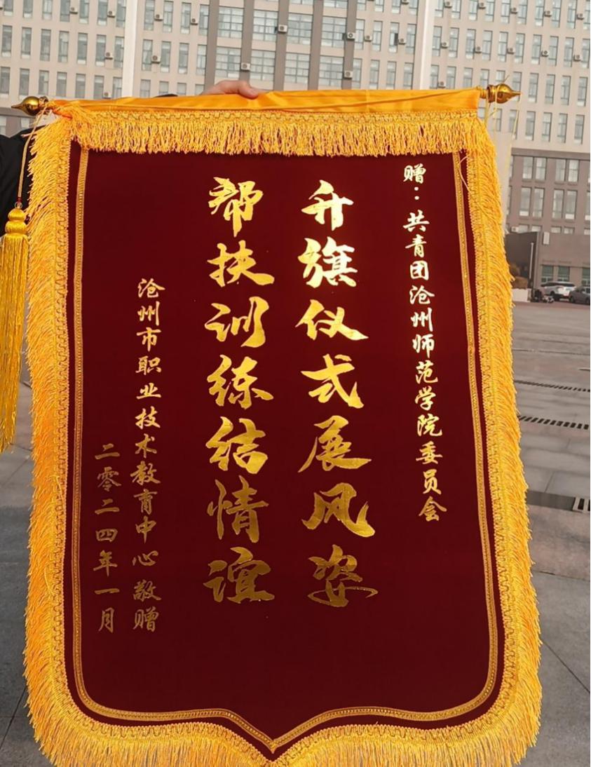 1月12日上午,沧州市职业技术教育中心教师一行五人来到伟德送上锦旗一面,对伟德团委派出国旗护卫队的学生协助其进行国旗班建设和训练表示感谢。