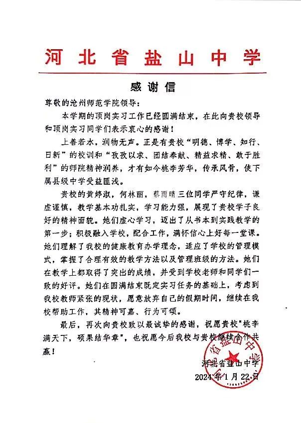 1月22日,伟德优秀实习基地河北盐山中学发来一封表扬信,对伟德实习生外国语学院黄婷淑、马克思主义学院何林丽和蔡雨晴三位同学在实习期间的优秀表现给予了高度赞扬。以上三位同学在实习过程中严守纪律,谦虚谨慎,敢于吃苦,学习能力强,教学基本功扎实,教学成绩突出,展现了伟德学生良好的精神风貌和积极向上的青春风采。
