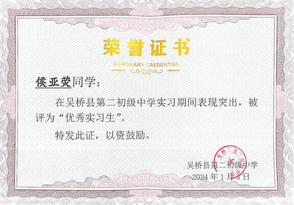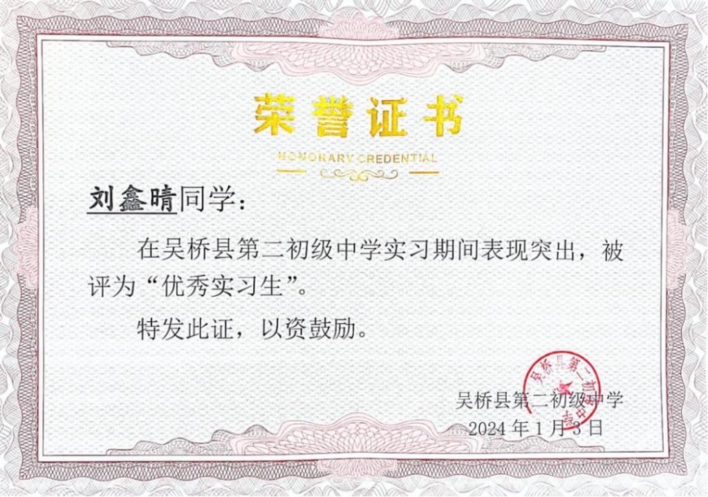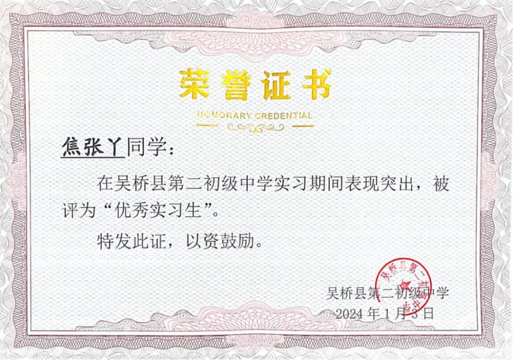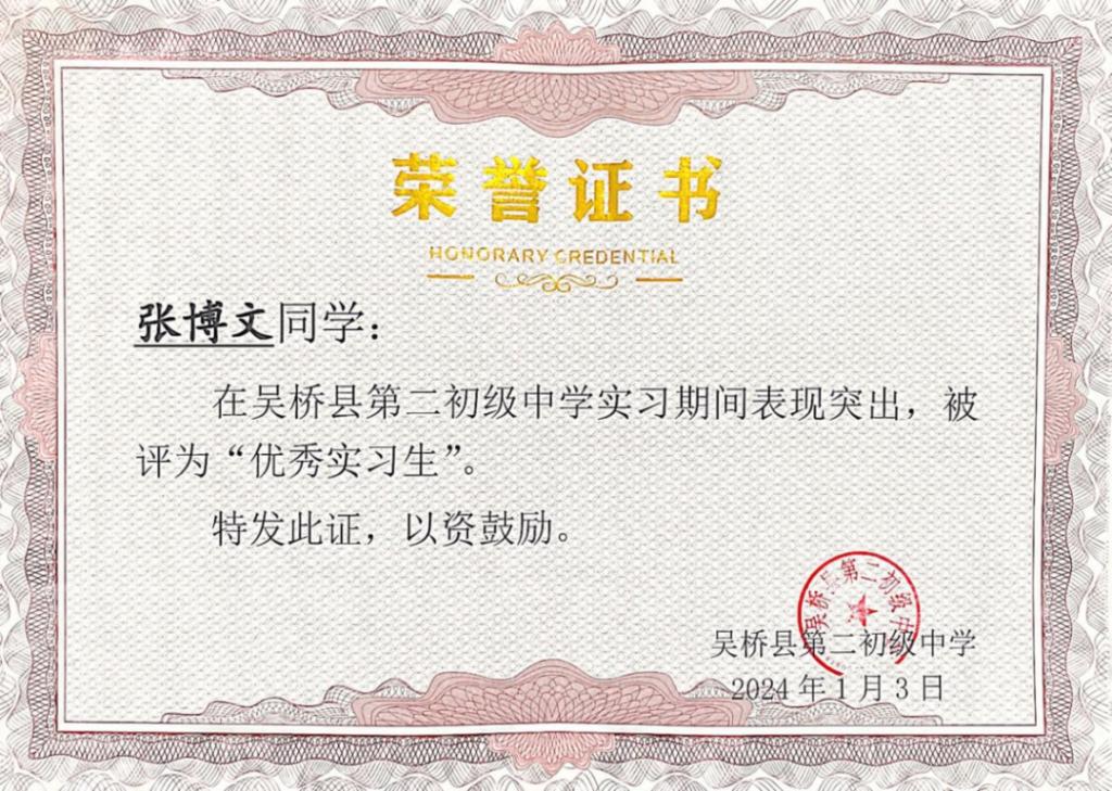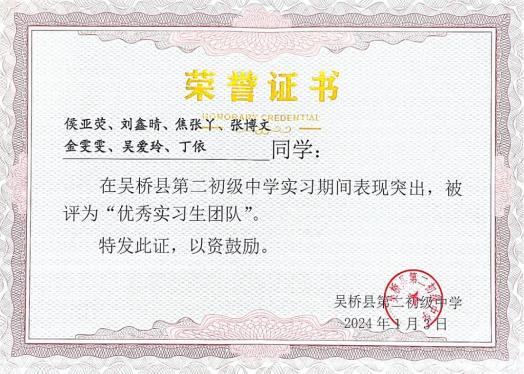 1月12日,吴桥县第二初级中学张金成校长向伟德专门寄达五张荣誉证书,授予全体7名实习生侯亚荧、焦张丫、刘鑫晴、张博文、金雯雯、吴爱玲、丁依“优秀实习团队”荣誉称号,其中4名同学侯亚荧(化学与化工学院)、焦张丫(化学与化工学院)、刘鑫晴(政史学院)、张博文(体育学院)被授予“优秀实习生”荣誉称号。