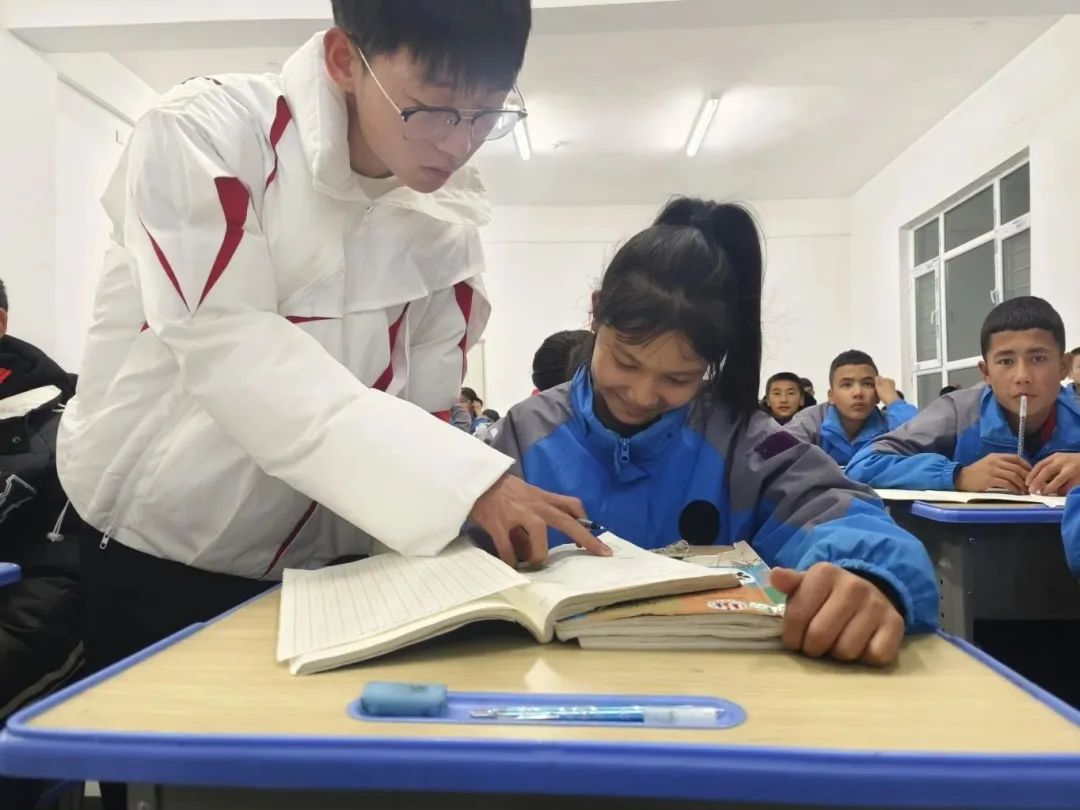 2023年盛夏时节,宋腾傲圆满完成3个月的实习支教任务回到学校。时隔两个月,2023年8月,宋腾傲又开始了第二次轮台之行。这次,他申请援助轮台县第一中学分校,因为,过完暑假,他上次教的那些孩子们大多都升学到了这里。宋腾傲:“我出现在孩子们面前时可把他们激动坏了,里三层外三层地围着我,又蹦又跳地喊着:‘宋老师,你回来啦!’‘宋老师,你真的又来啦!’”
