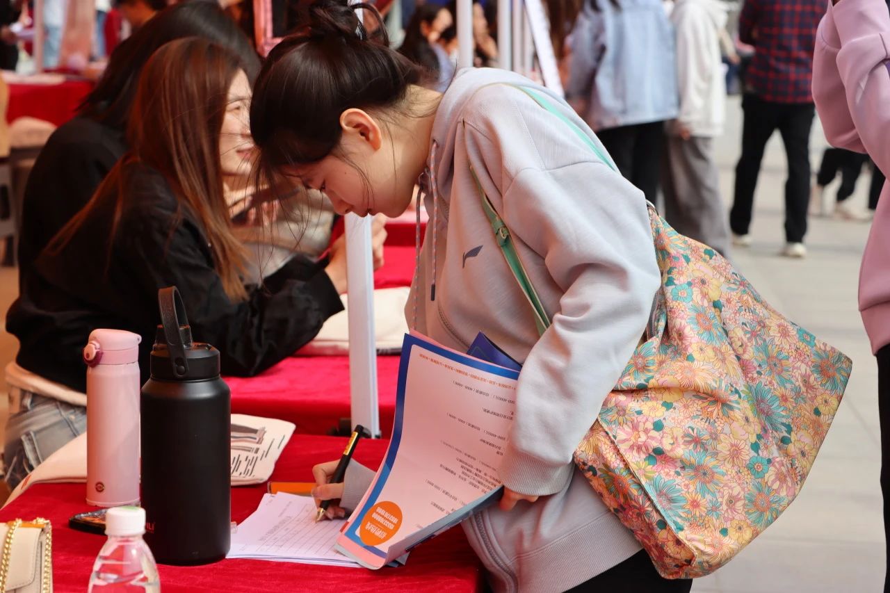 双选会现场热闹非凡,各展位前人头攒动。招聘企业通过展板、海报、画册等方式向学生介绍企业的基本情况、发展前景、职业优势以及企业文化等。学生们自信表达,积极与用人单位交流,深入了解更为全面的工作要求、职业发展等问题。现场还提供校企对接、就业政策宣传、创业孵化基地入驻等服务,设有西部志愿者计划招募、大学生征兵宣传、“三支一扶”咨询等窗口和展板,为同学们提供全面的就业渠道。