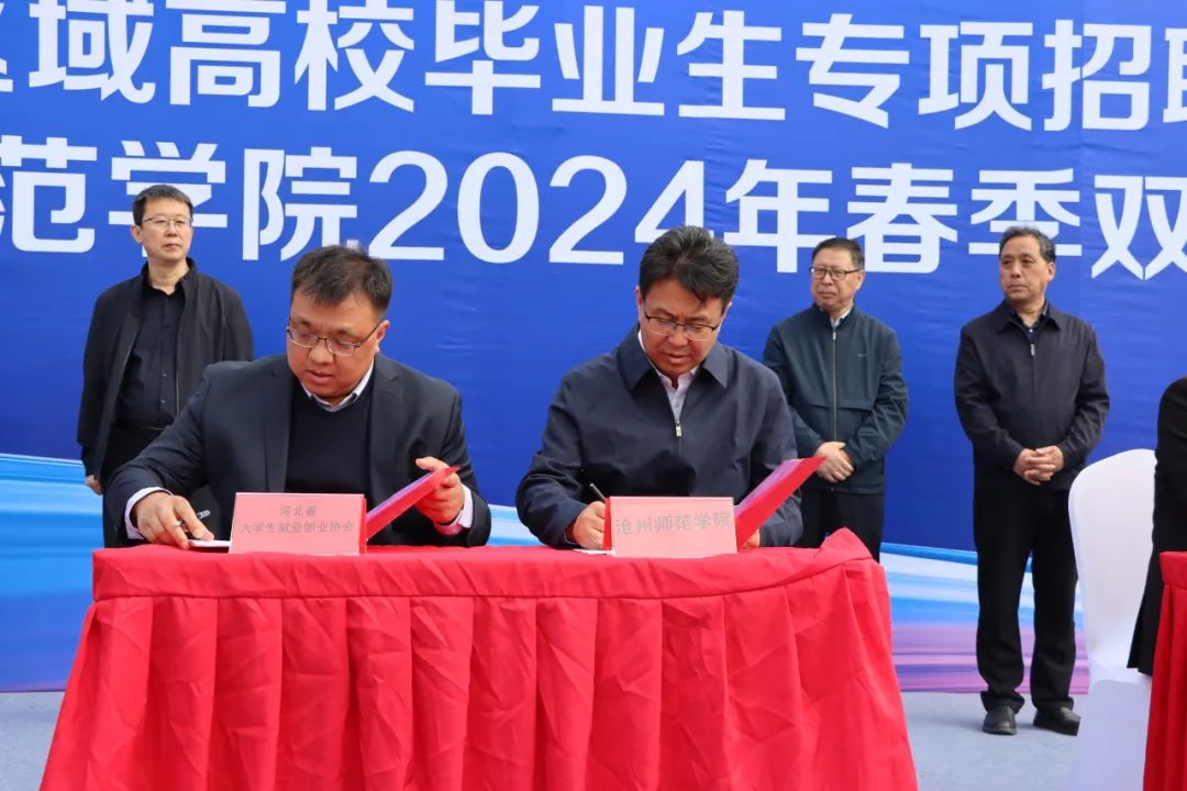 校企联动促就业,双选会现场,云电军、大学生创新就业服务中心主任胡斯亮、商学院院长张兰新分别与河北省大学生就业创业协会代表陈国亮、河间天河高级中学校长卓士学、信誉楼集团朝阳店总经理马君山签署合作协议。