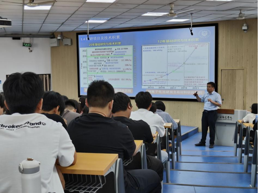 时志强从双电层理论和双电层结构模型、基于双电层理论的实验研究等方面,深入浅出地讲授了电化学领域的重难点知识以及团队十余年的科研成果。同时,他结合当前新能源和新材料的科研热点,展示了目前超级电容器的产业化建设以及新能源汽车行业发展情况。讲座现场气氛热烈,同学们积极与专家交流了专业课学习、考研专业方向、新能源和新材料行业就业及发展等问题。讲座后,时志强就相关研究方向与老师们进行了深入探讨,并就专业学科建设,本科生培养及研究生联合培养等问题达成进一步合作意向。
