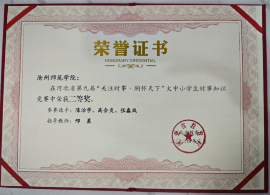 5月24日至26日,由河北省教育厅主办,《时事报告》河北教学服务中心承办的河北省第九届“关注时事·胸怀天下”大中小学生时事知识竞赛省级决赛在石家庄市举办。由伟德马克思主义学院陈治学、高会炎、张鑫凤三名同学组成的代表队荣获全省高校组二等奖。
