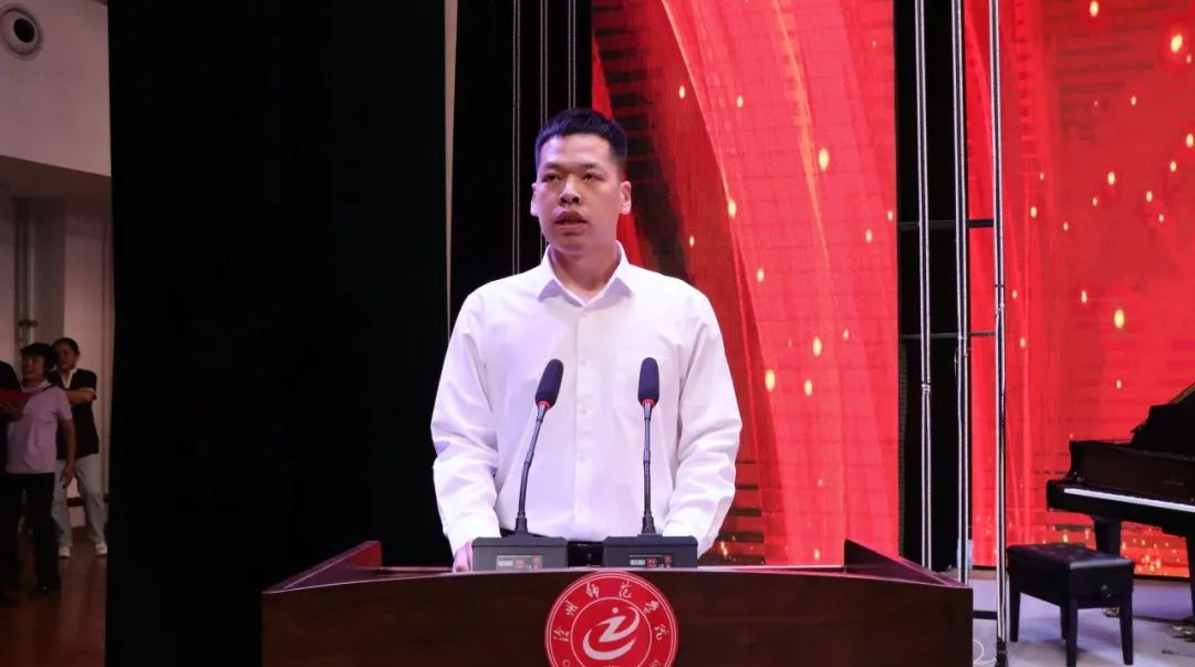 化学与化工学院毕业生马彬智父亲马强作为家长代表发言:“愿大家把个人理想融入党和国家的事业当中,为党、为祖国、为人民多作贡献,展现师院人独有的风采。”