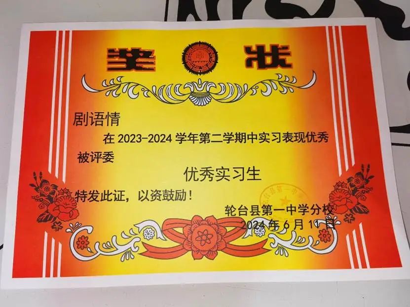 剧语情同学充分发扬“能吃苦”“善钻研”“上手快”的支教精神,善于多种方法奖励、鼓励学生,提高了学生的积极性,因为表现优秀,被轮台一中分校授予优秀实习生荣誉称号。