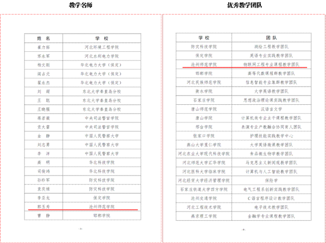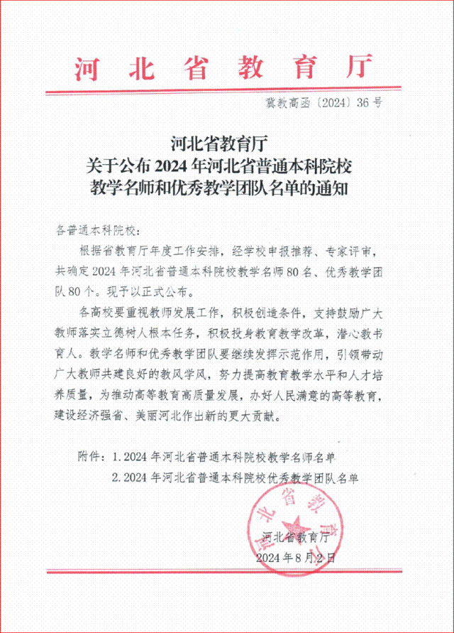 近日,河北省教育厅下发了《关于公布2024年河北省普通本科院校教学名师和优秀教学团队名单的通知》(冀教高函〔2024〕36号)。伟德物理与信息工程学院郭玉秀教授获评“河北省普通本科院校教学名师”,计算机科学与工程学院马文娟教授负责的物联网工程专业课程教学团队获评“河北省优秀教学团队”。