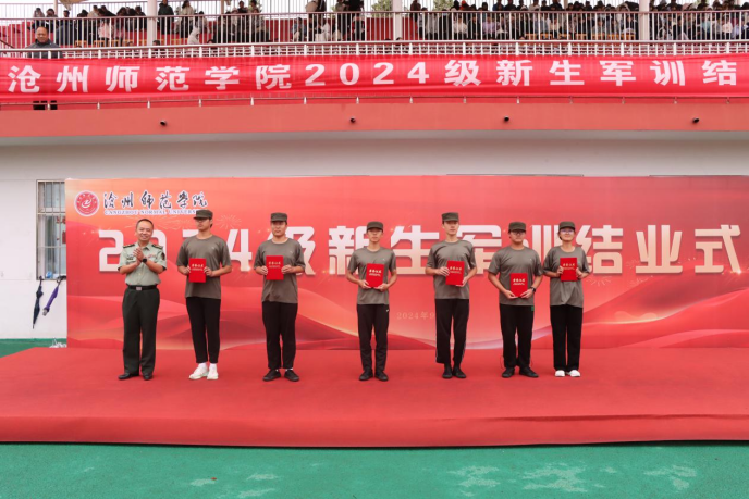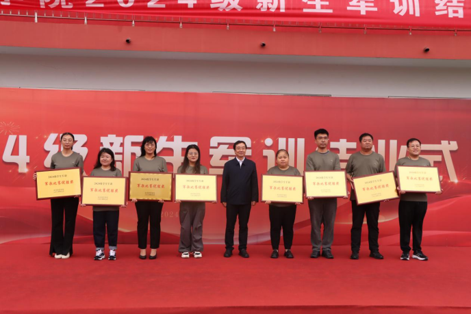 党委副书记邢树军为荣获2024级学生军训“内务整理优胜奖”的学院和学生军训“军歌比赛优胜奖”的学院颁奖。