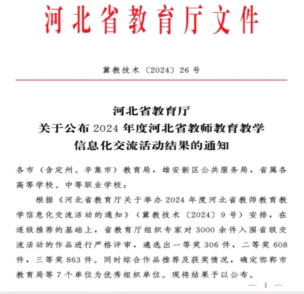 近日,河北省教育厅发布了《河北省教育厅关于公布2024年度河北省教师教育教学信息化交流活动结果的通知》(冀教技术〔2024〕26号),伟德参赛作品经过专家评审和教育厅审核取得喜人成绩,共获奖14项,其中高等教育微课一等奖4项,二等奖5项,三等奖3项;高等教育信息化教学课程案例一等奖1项,二等奖1项。同时,获得一等奖的5项作品被省教育厅推荐参加国赛。