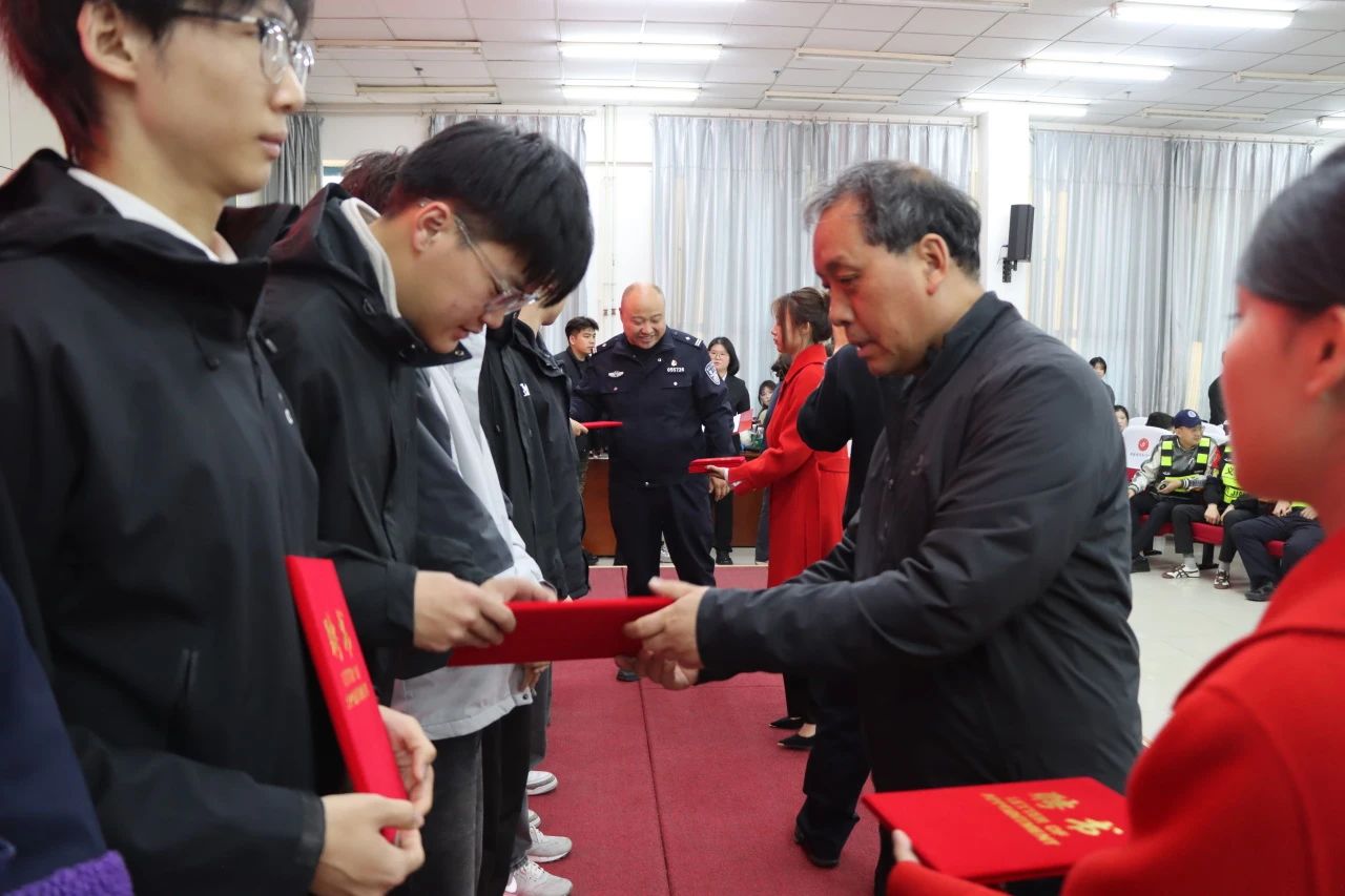 活动中,范小振和张卫华为大学生义警代表们颁发聘书,鼓励同学们积极加入大学生义警队伍。
