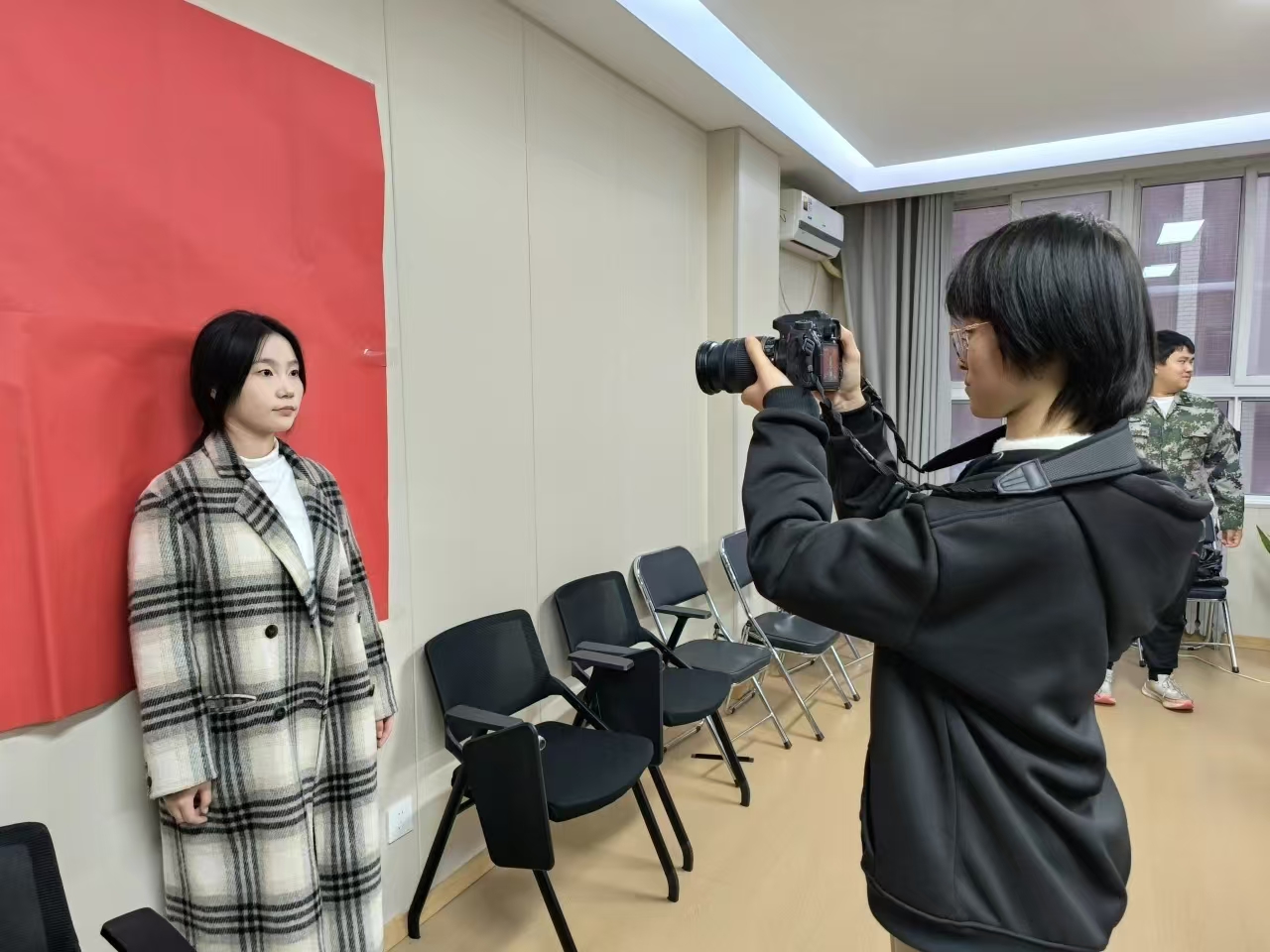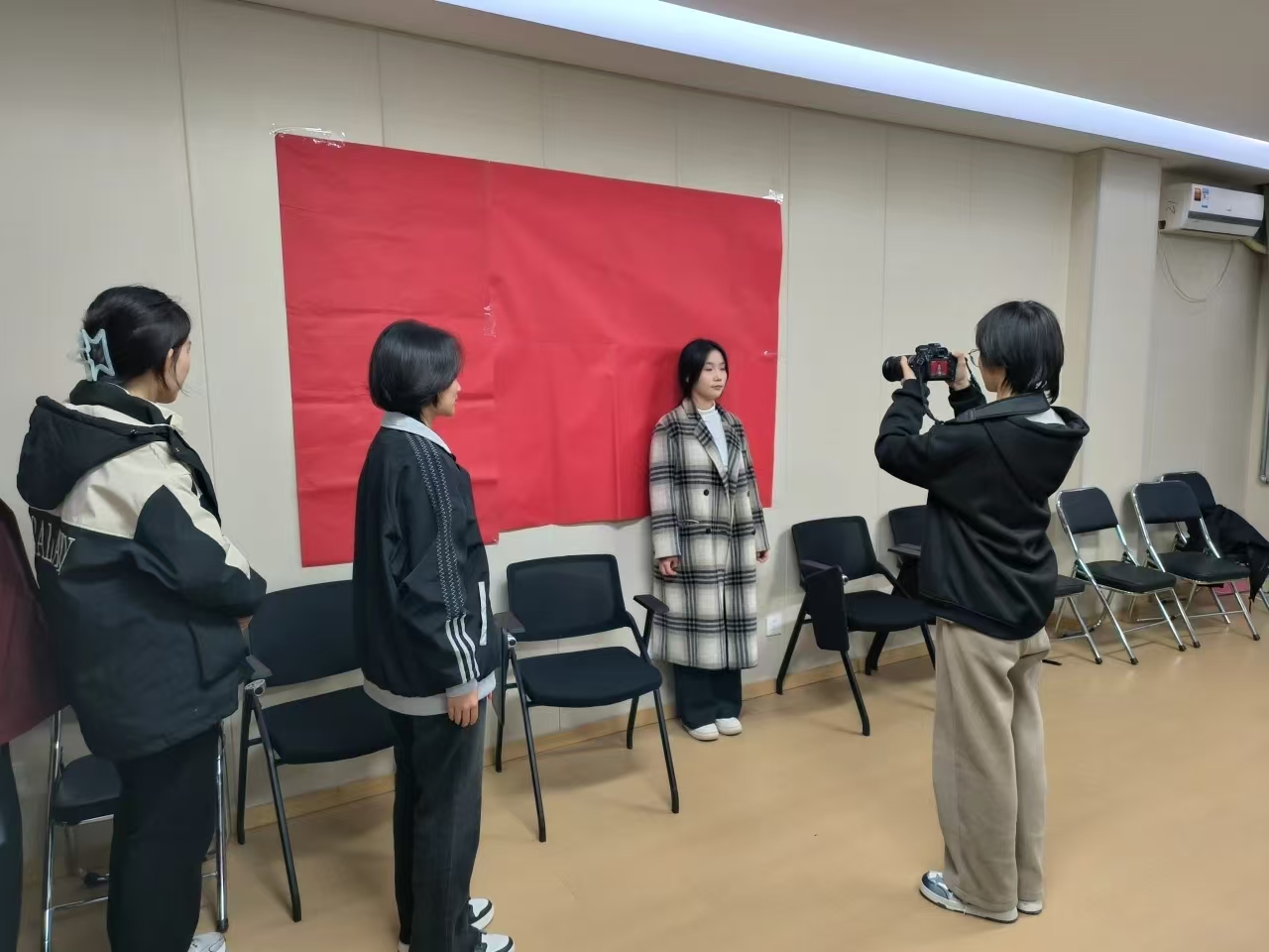 拍摄现场,精心布置的拍摄区域成为了一道靓丽的风景线。学生们按照预约时间陆续前来。志愿者们分工合作,每个环节都耐心服务。学生志愿者携带相机、三脚架、幕布等专业拍摄工具,分工明确,耐心细致地为每一位同学调整姿势、挑选背景,力求拍摄出最满意的证件照片。