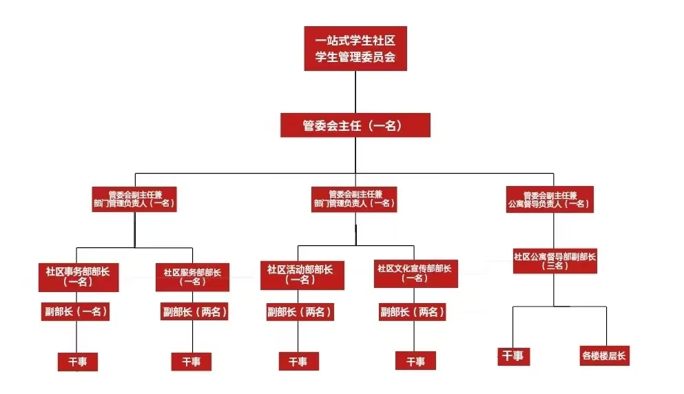 为高效运行此综合性服务平台,一站式学生社区管理委员会下设五大核心部门:社区事务部、社区活动部、社区服务部、社区文化宣传部、社区公寓督导部。