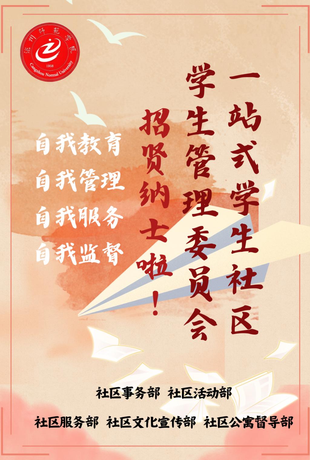 “一站式”学生社区学生管理委员会的职能主要包括:学生党团建设、心理疏导、学业指导、学生管理、社区服务、文娱健身、社团活动、国防教育及征兵动员、退役军人服务、后勤保障、网络互动、媒体运营、休闲交流、创新创业、综合服务等。为充分发挥“一站式”学生社区学生管理委员会效用,现招贤纳士!