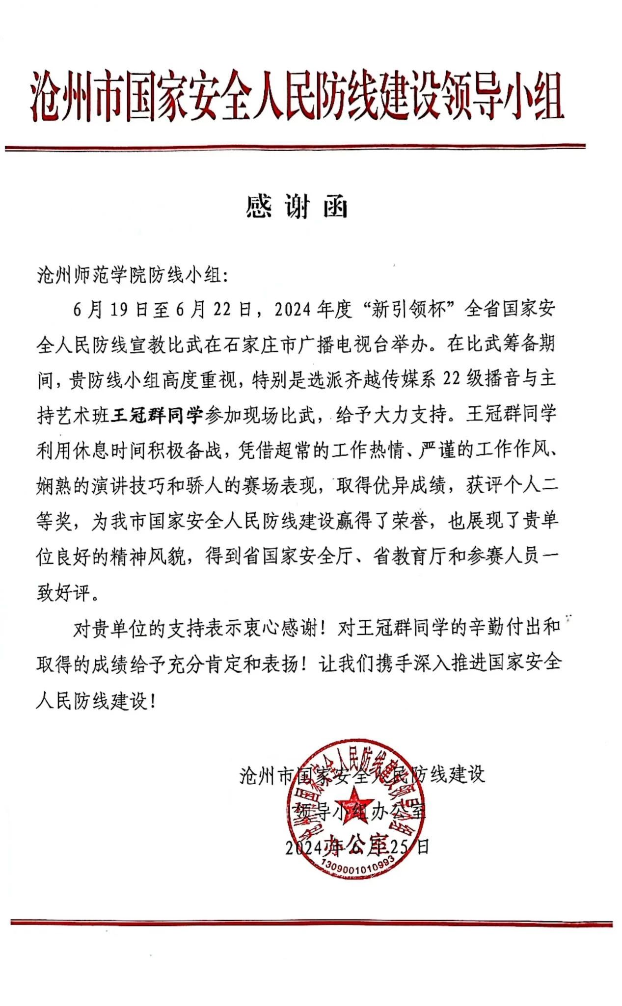 沧州市国家安全人民防线建设领导小组办公室发来感谢信,对王冠群同学的优秀表现和伟德的大力支持给予表扬感谢。