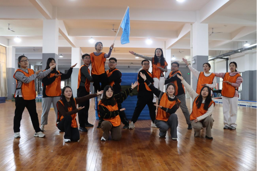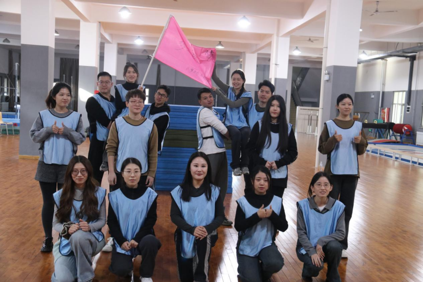 王峰教练通过“按摩操”“集中精神”“爱的鼓励”三个热身小游戏点燃了老师们的热情。新教师分为2组,每组在队长、副队长和旗手的带领下拟定队名、队训和队歌,绘制队旗、排练队形。在团队成员的精心编排下,两队展示了各自风采。