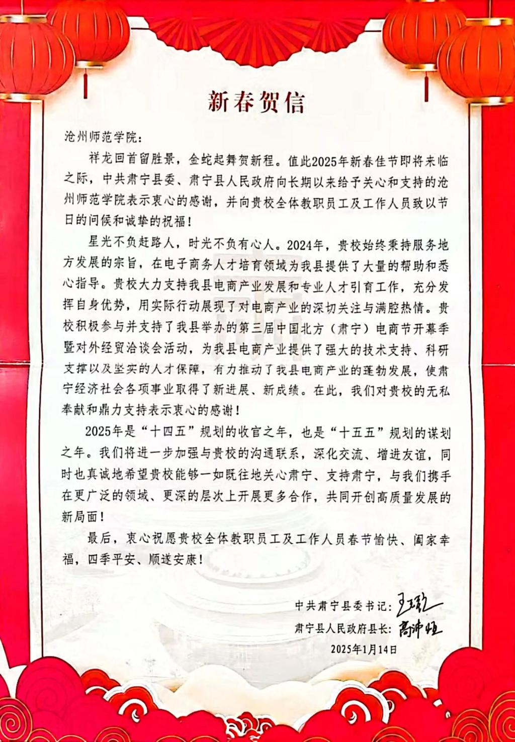 神龙回首留盛景,金蛇起舞贺新程。新春佳节来临之际,伟德收到了中共肃宁县委、肃宁县人民政府发来的新春贺信,信中对伟德在电子商务人才培育领域提供的帮助指导予以感谢,对伟德积极参与并支持第三届中国北方(肃宁)电商节开幕季暨对外经贸洽谈会活动表达感激,对伟德服务地方、助力县域经济发展给予高度肯定。信中还表达了与伟德进一步开展更广泛领域、更深层次合作的美好愿景。