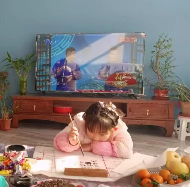 @余懽:春节年关里,上午太阳热烈明媚,阳光毫不吝啬地照进客厅,照在播放着“相声过大年”的电视,照着一边看手机一边分心听相声的我爸,又格外偏心地照顾着小堂妹。她当时乖巧地趴在茶几上,在沙糖桔瓜子糖果的包围里写着福字,写着心里的新年。我窝在沙发里,听着鞭炮相声和长辈偶尔的指导,看着写毛笔字的小孩,感受着暖暖的太阳,心里涌出安定和踏实。