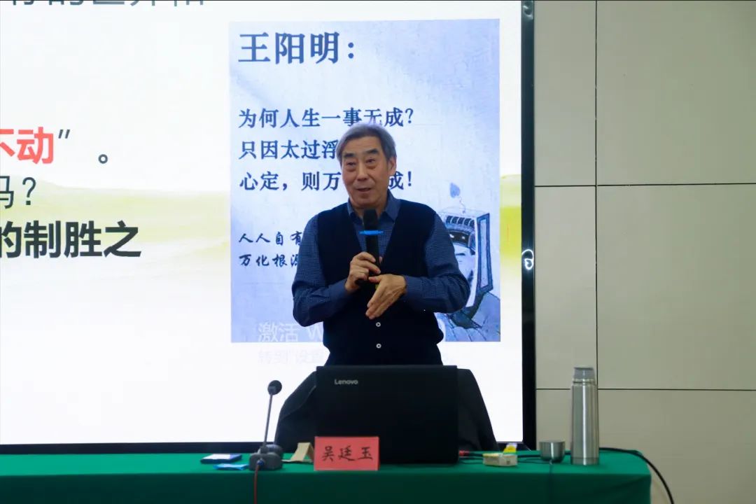 吴廷玉教授以“为己·克己·成己 立德·立功·立言”为题,从“缺啥补啥——阳明心学为什么在今天火起来”“为己、克己、成己——王阳明揭示的成功路线图”“立德、立功、立言——王阳明昭示的人生方向标”三个篇章出发,根据自己多年的研究,对王阳明“真三不朽”的圣贤形象做了逼真素描,精准解读了阳明心学的养心智慧、通心智慧与和心智慧,深刻阐释运用阳明心学解决当前问题的方法意义。他将国学知识与人生修养相结合,从熵增定律、乌卡巴尼叠加效应,谈如何破局;从“为己、克己、成己”之道,谈如何修身;从“立德、立功、立言”之法,谈如何慎行,带领全体干部从阳明之悟中得到人生启迪。