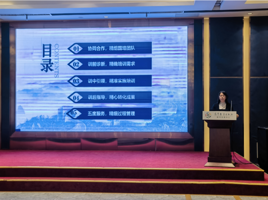 在国培工作中,我始终秉持“以学员需求为中心”的理念,带领团队积极探索,不断创新,形成了“五精并举”的国培工作模式,即“精准调研、精心设计、精细实施、精致服务、精彩呈现”。