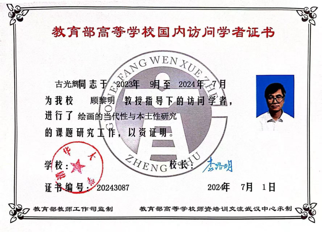 古光辉老师在2023年9月至2024年7月期间,以访问学者身份在清华大学美术学院顾黎明教授指导下开展 “绘画的当代性与本土性研究” 课题,期间成功完成两项省级课题及两项横向课题申报。目前,古老师返校后持续推进课题相关专著及论文撰写工作。