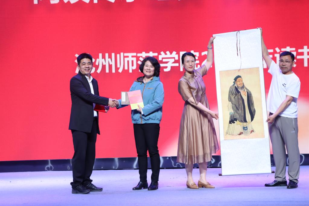 朱蓬华及党委宣传部部长李健、团委书记李倩、学生处处长辛智广向教师读书之星和学生读书之星颁奖。