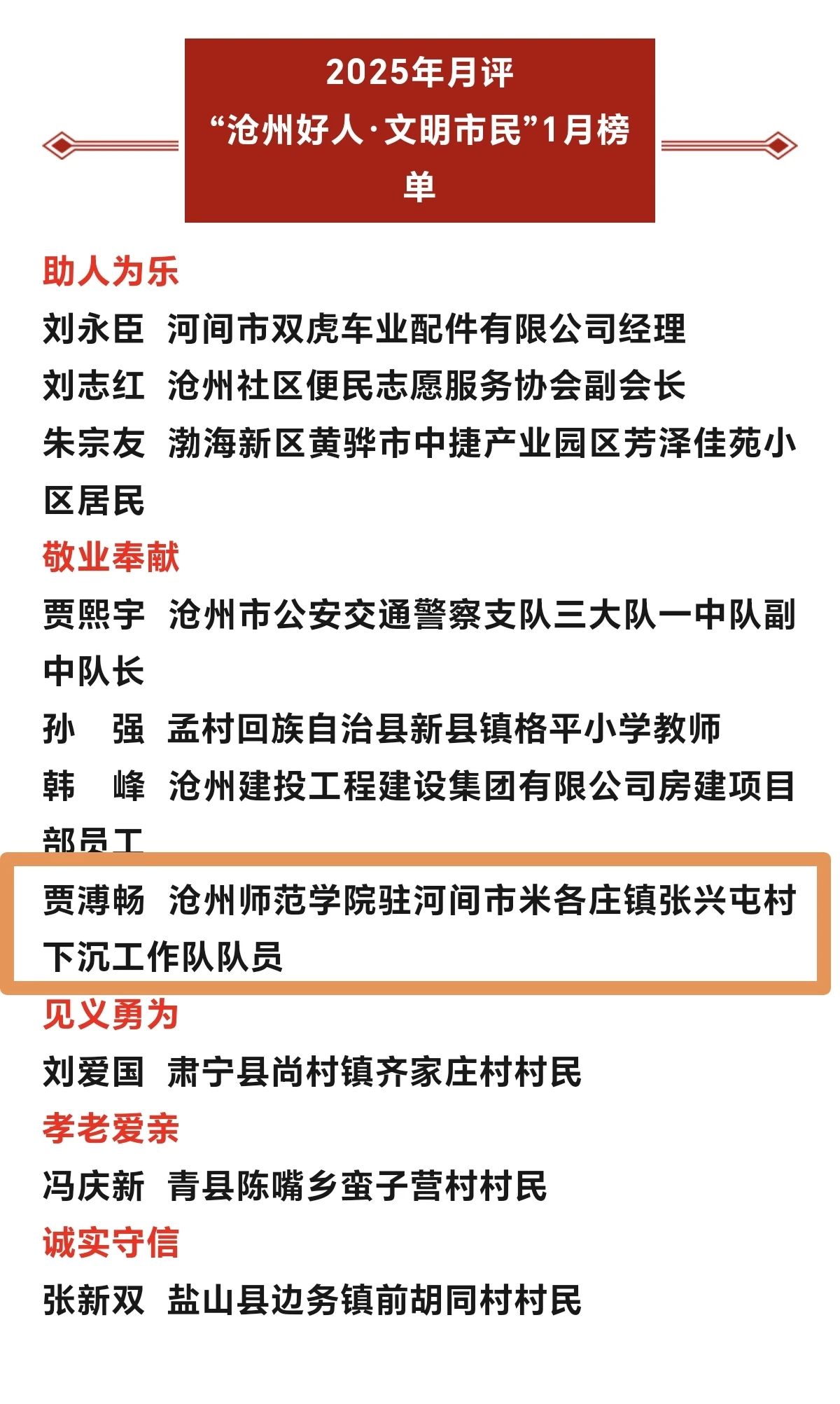 4月29日,月评“沧州好人·文明市民”揭晓,伟德齐越传媒学院教师、驻河间市米各庄镇张兴屯村下沉工作队队员贾溥畅入选2025年月评“沧州好人·文明市民”1月榜单。