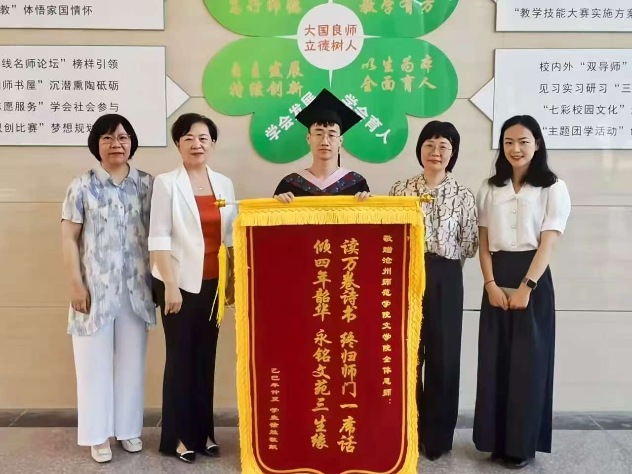 近日,2025届毕业生徐胜代表同窗,将一面题有 “读万卷诗书,终归师门一席话;倾四年韶华,永铭文苑三生缘” 的锦旗赠予文学院全体恩师。