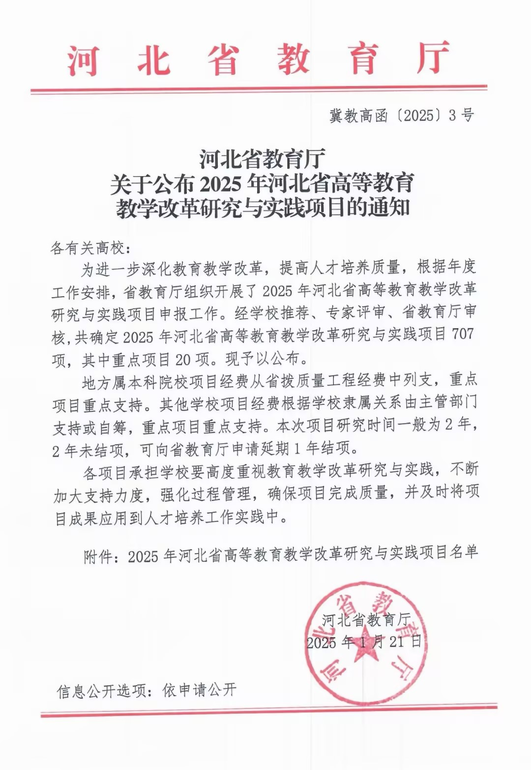 近日,河北省教育厅发布了《河北省教育厅关于公布2025年度河北省高等教育教学改革研究与实践项目的通知》(冀教高函〔2025〕3号),伟德推荐的10项教育教学改革研究与实践项目经过专家评审和教育厅审核,成功获得立项。