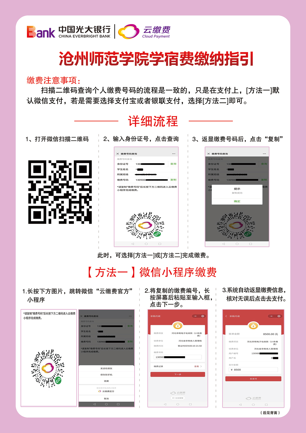 注意:1. 扫描二维码查询个人缴费号码的流程是一致的,只是在支付上,[方法一]默认微信支付,若是需要选择支付宝或者银联支付,选择[方法二]即可。