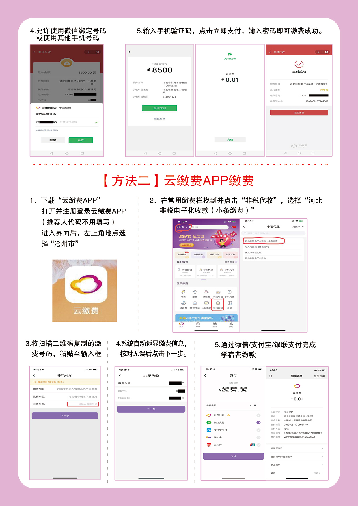 详细流程【方法一】微信小程序缴费和【方法二】云缴费APP缴费见下方附件: