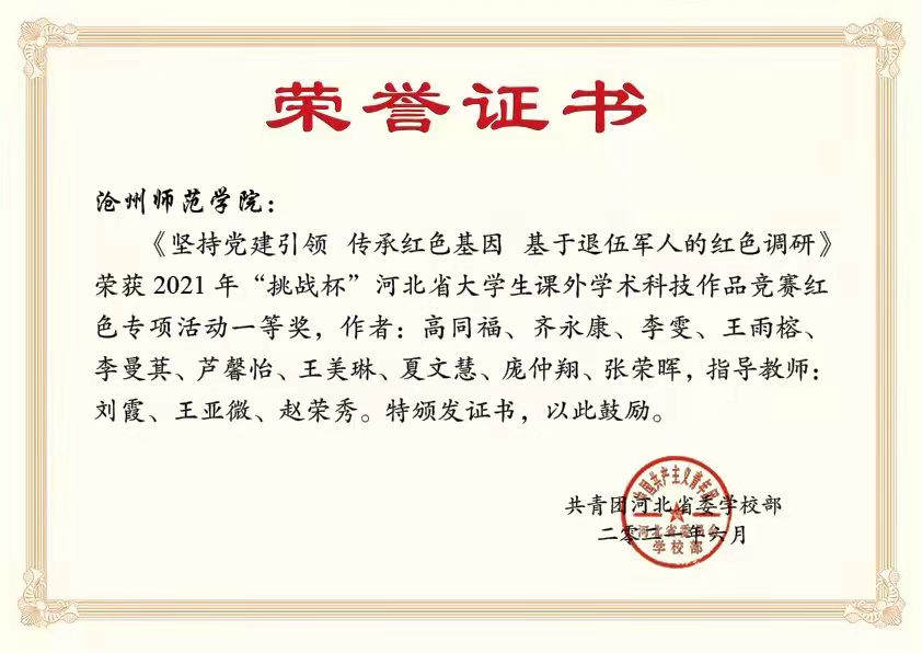 团队建于2020年3月,经过“挑战杯”、“创青春”、“互联网+”大学生创新创业大赛的磨练,取得了河北省“挑战杯”创新创业大赛二等奖并进入国赛直通车,同时成功申请实用新型专利一项;获“挑战杯”河北省大学生课外学术科技作品竞赛红色专项活动一等奖;获第十届中国(河北)青年创业创新大赛、第八届“创青春”大赛(河北赛区)暨2021年中国(河北)青年创新创业交流营赛事优秀奖。团队调研项目《坚持党建引领 传承红色基因 基于退伍军人的红色调研》聚焦疫情之下的退伍军人群体,探寻红色记忆,传承红色基因,践行初心使命。