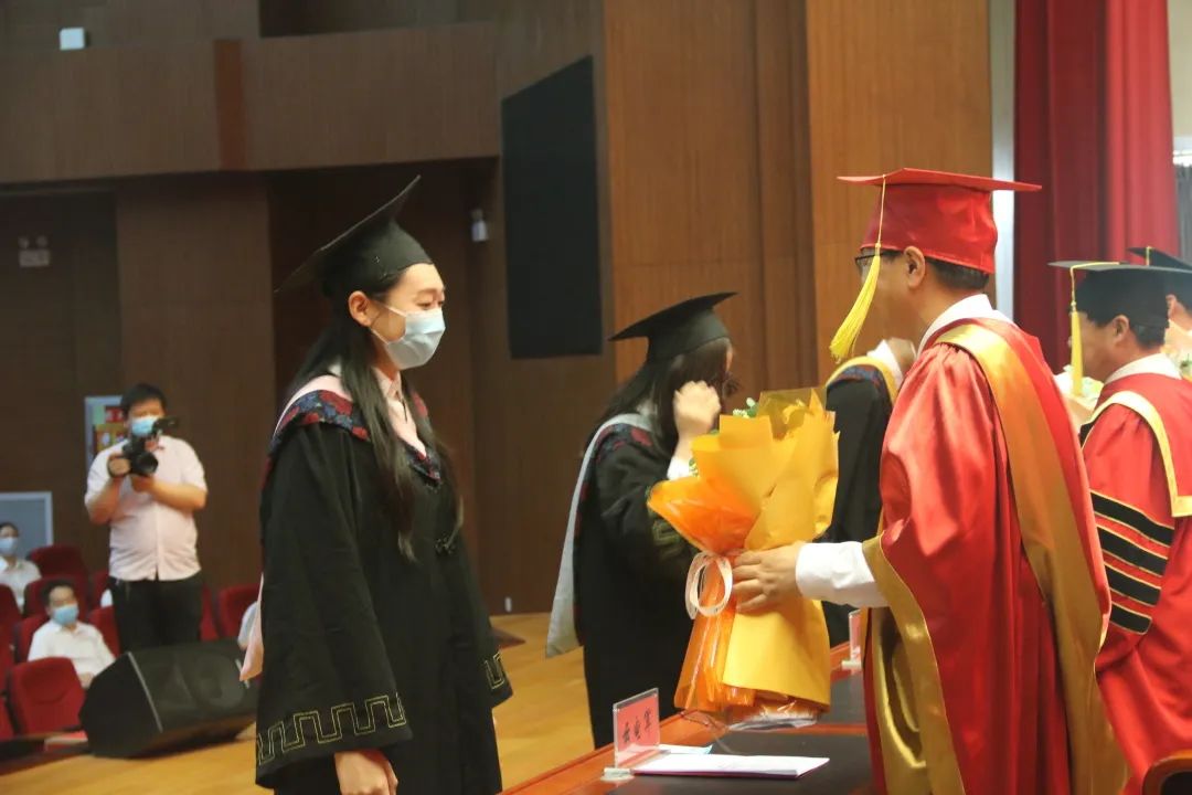 校领导为毕业生代表拨穗正冠,亲授证书,毕业生代表将鲜花献给领导老师,心怀感恩与不舍,为自己的学业生涯画上一个时期的终止符。