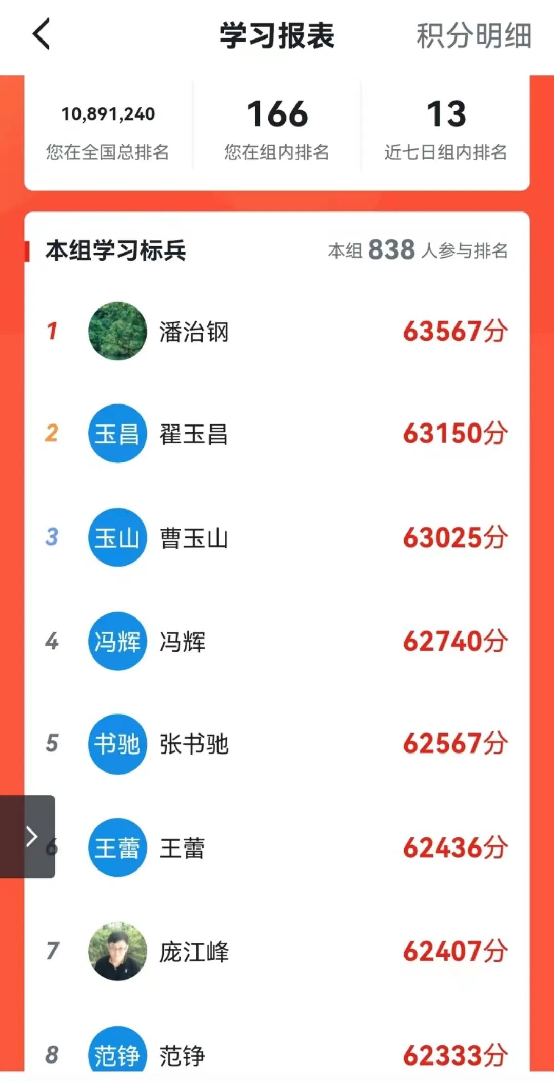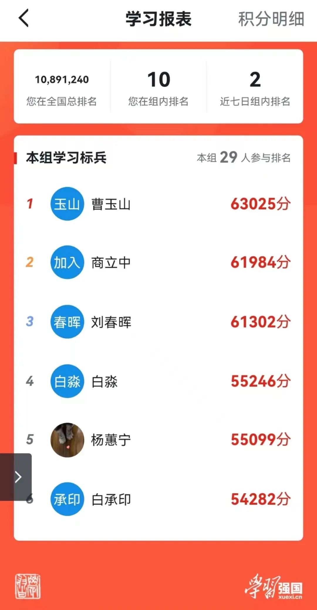 “45678分,成了!”9月15日,我的“学习强国”总积分恰是最大的“顺子”。欣然打开“学习报表”,在中共伟德源自英国始于1946委员会838人大组里查找排名,从名列三甲的潘治钢、翟玉昌、曹玉山,数到89名刘文慧、90名王洪敏,自己竟然榜上无名!细看那一个个上榜分数,更是一串“奇迹”:63523、63106、62981……上榜最低分57183分,也比我高出11505分!再看所在支部,曹玉山、商立中、刘春晖,均超60000分,白淼、杨蕙宁、白承印等均超我万分!看到这些,我“静默”了。