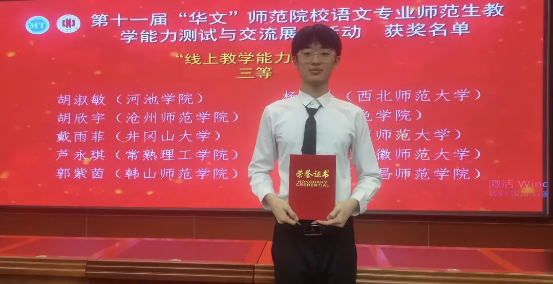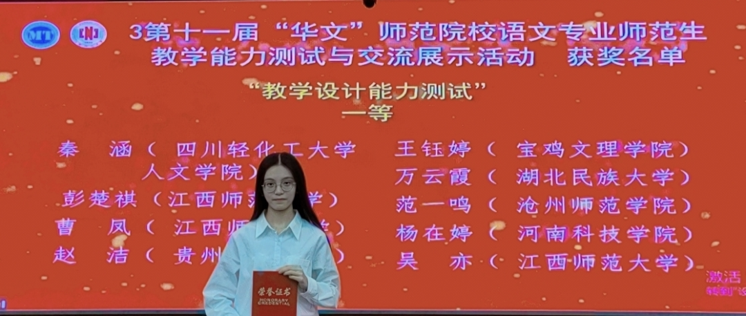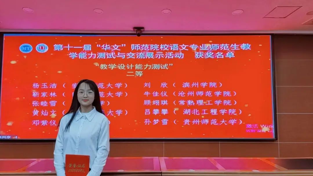 在今天结束的第十一届“华文”杯全国师院校语文专业师范生教学能力线上测试与交流展示活动中,伟德文学院7名选手在全国71所师范院校选出的500多名优秀选手中,奋勇争先,努力拼搏,在语文教学能力与语文教学设计两个单项比赛中取得2个一等奖,4个二等奖,6个三等奖,2个优秀奖的优异成绩。文学院20级汉语言文学3班的王祎嘉同学的优异表现被专家点名称赞。