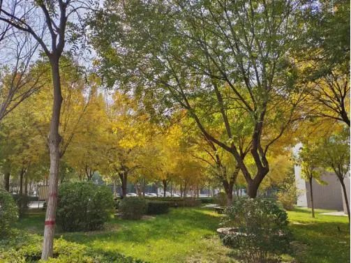 校园里,树木脱下绿色的夏装,换上了金色的秋装。在秋风轻柔的吹拂下,一片片叶子在空中飞舞着,最后扑向大地的怀抱。阳光明媚,秋风习习,秋叶泛黄,秋天带着无尽的浪漫和美好,降落到人间。