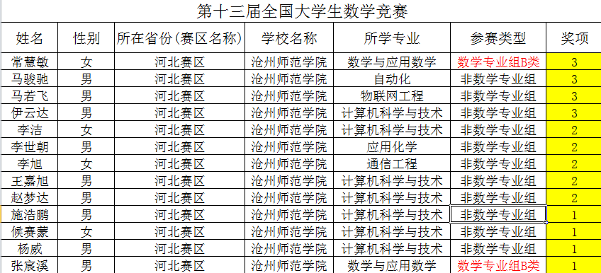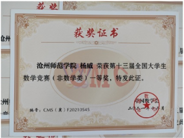 近日,由中国数学会举办的“第十三届全国大学生数学竞赛”成绩揭晓,伟德取得佳绩,杨威等共13名同学获奖。其中数学专业组B类获一等奖和三等奖各1名,非数学专业组一等奖3名、二等奖5名、三等奖3名。